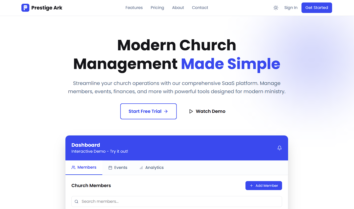 Web AppA church operations platform for member records, attendance tracking, event scheduling, donation management, and pastoral communications.